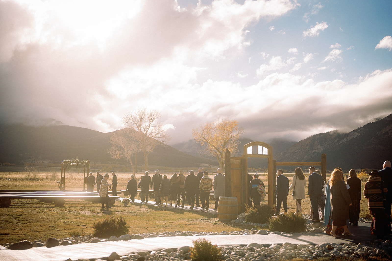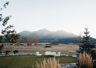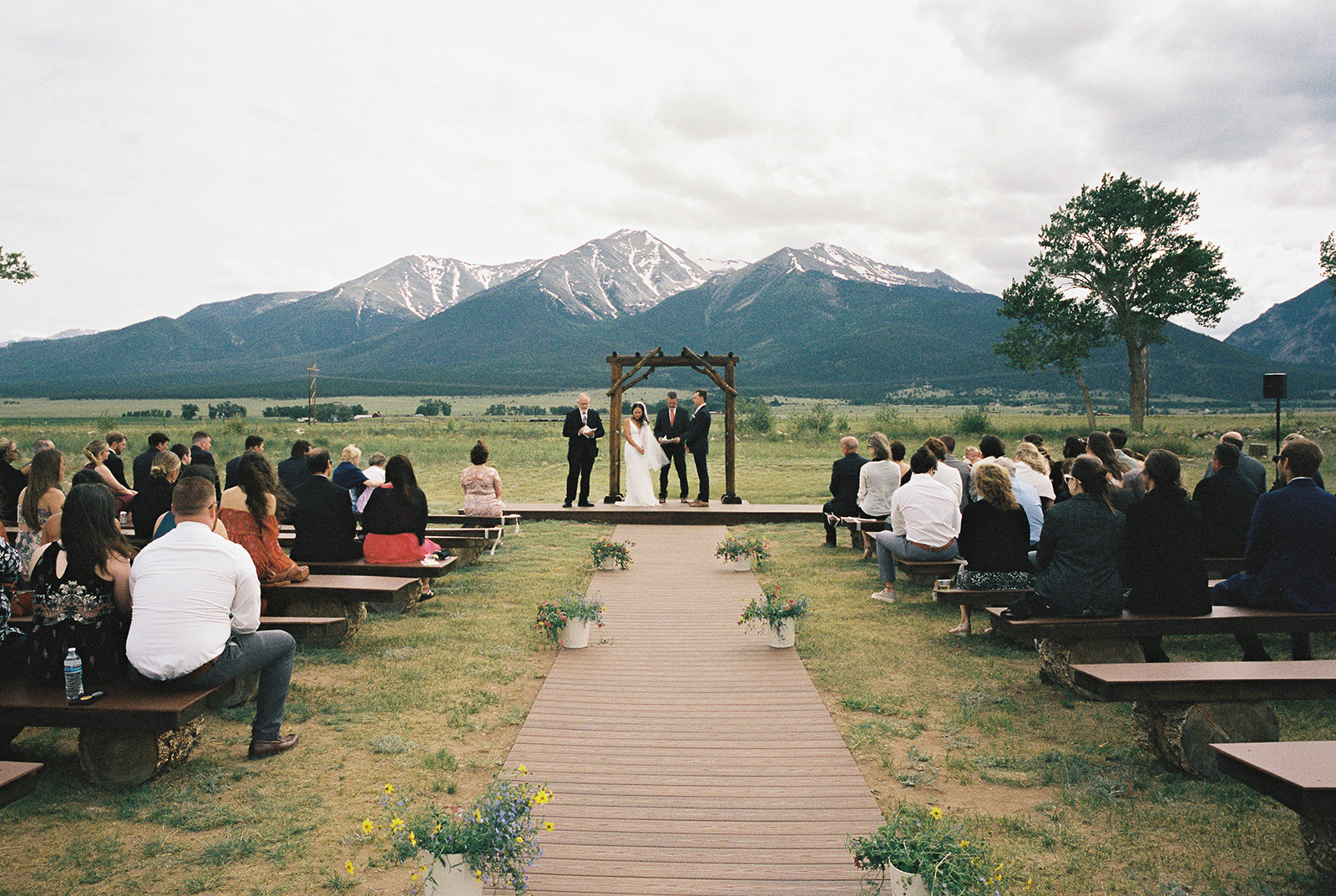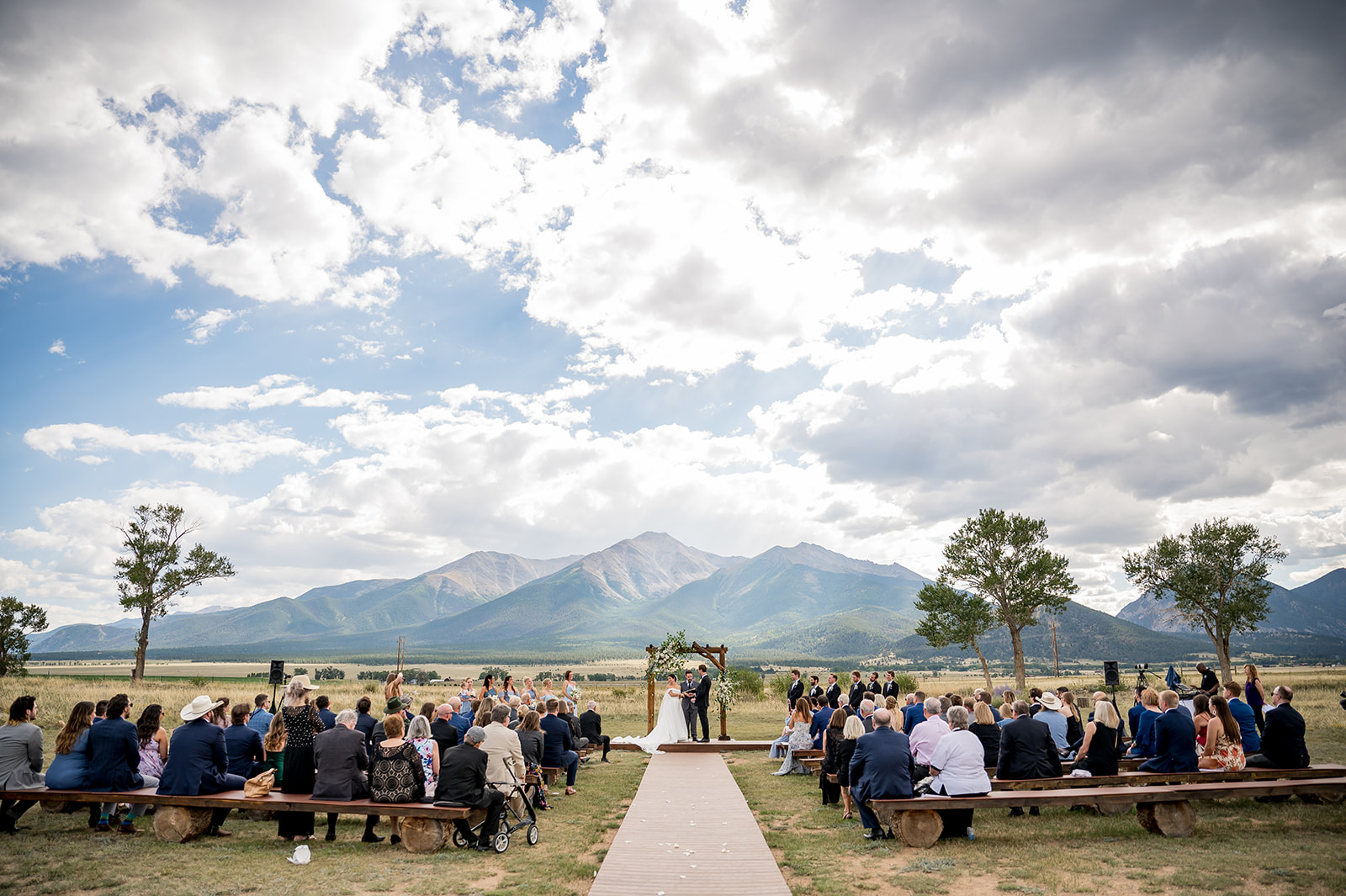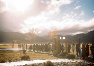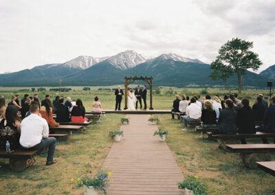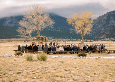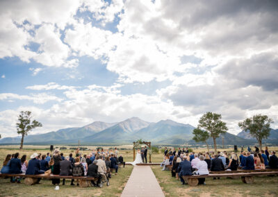 - Wedding ceremony meadow with seating, an arch, and beautiful mountain views